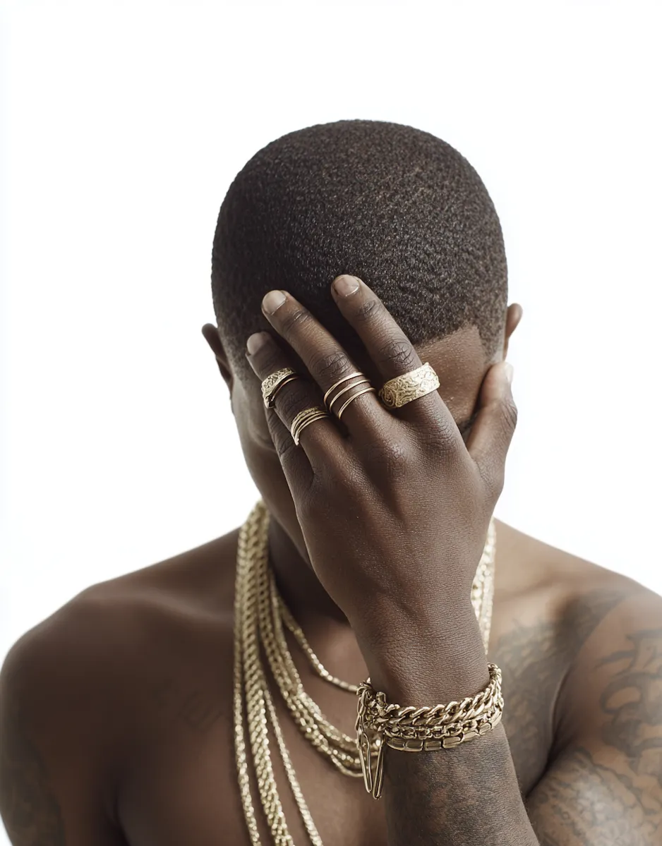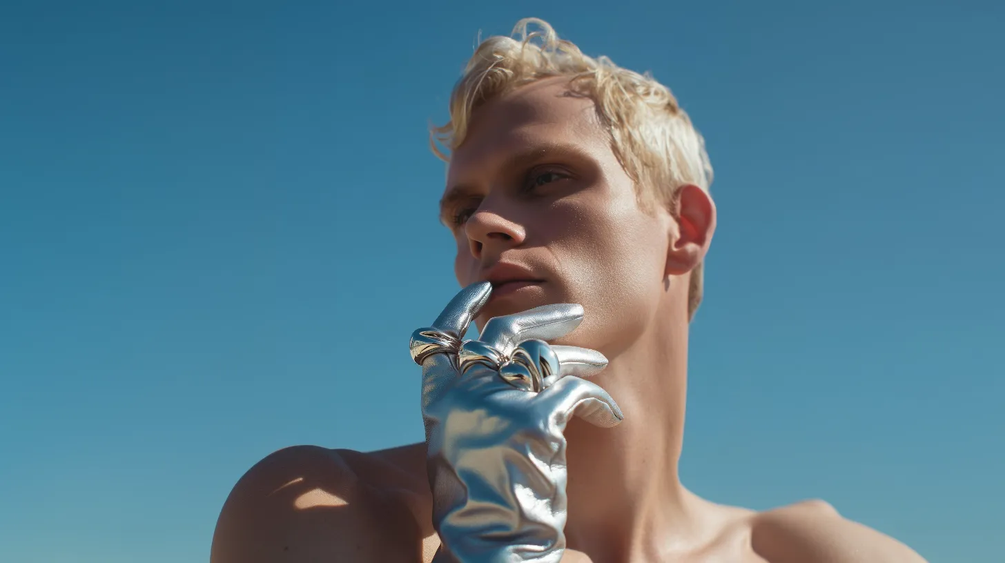 A man in a black turtle neck sweater.A woman wearing a black turtle neck top.A man wearing a brown coat and a brown hat.A woman in a black jacket is looking at the camera.A man standing in the middle of a dark room.A silver purse sitting on top of a red chair.A woman with her eyes closed with a rainbow light on her face.